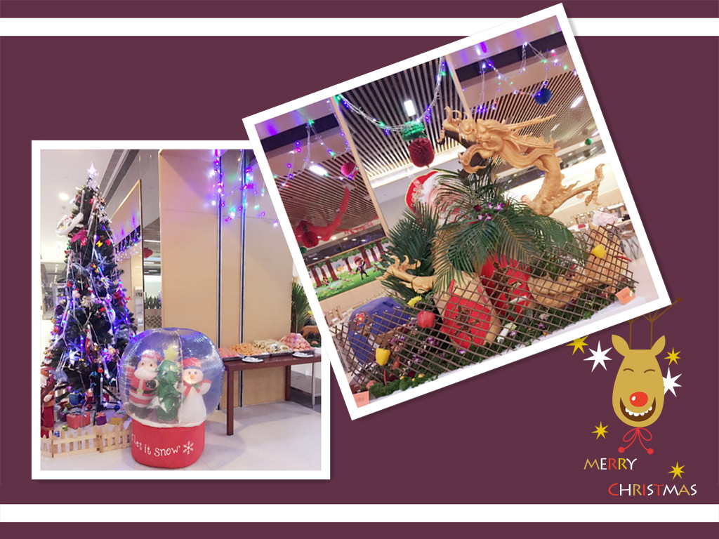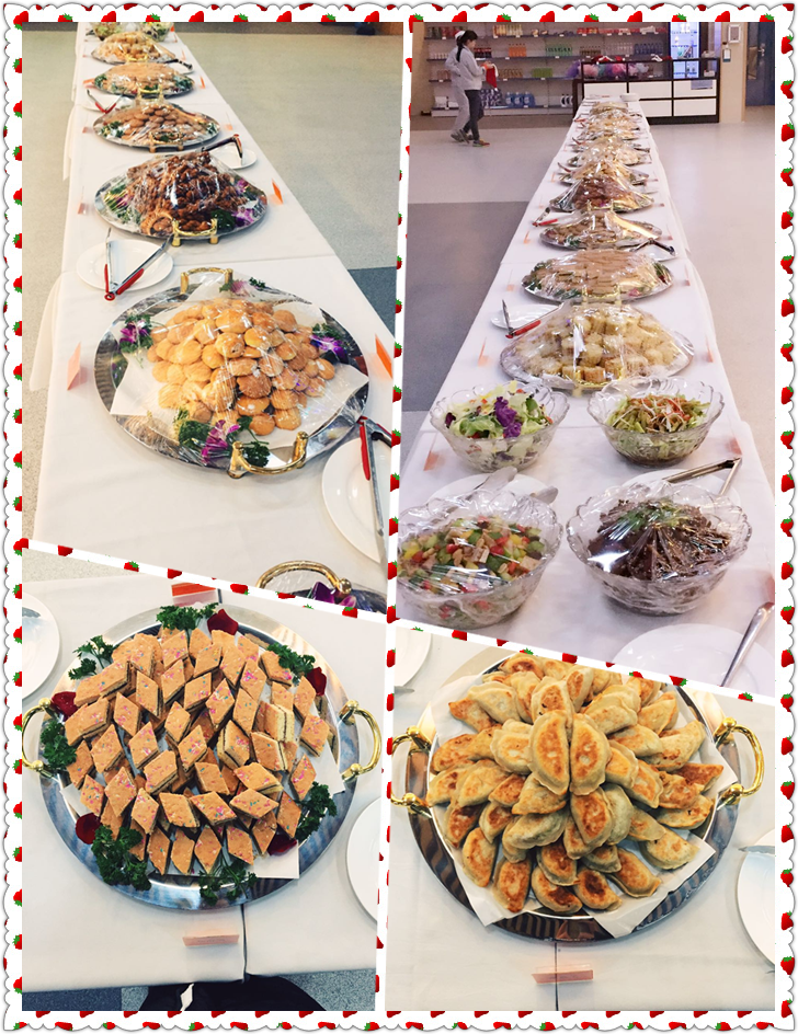 12月25日中午,餐厅里挂满了闪亮的灯,竖起了美丽的圣诞树,电视上播着各个部门为圣诞节而拍摄的集体照,耳边回荡着充满节日氛围的欢快音乐。点餐的窗口改造成了自助取餐的餐台。京味点心,西式糕点,日式菜肴,意式面点,水果沙拉、蔬菜沙拉等应有尽有,所有食物供员工自由选择,且所有食物均无限量供应。
